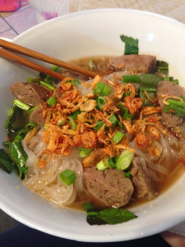 Once you've finished cooking the broth, you can strain it and drink it as is, 8-12 ounces per day, first thing in the morning. However, you can also use it to create great dishes with Asian flair. What I did in the above photo is an example of just that. I took rice noodles, which can be put into a bowl and with hot broth placed on top, that is all the cooking they need! You can also dip them into boiling water for about 30 seconds to rehydrate them. To the broth and the rice noodles, I added quartered organic meatballs (pre-cooked). Then comes the fun part, the toppings. This broth really benefits from some crispness. For this bowl, I chopped large leaf cilantro (my FAVORITE!!!) and green onion. I also added a little fried red onion that can be picked up at any Asian market. You could also add bean sprouts. Those really add a great crunch. I recommend eating with chopsticks and a large spoon.